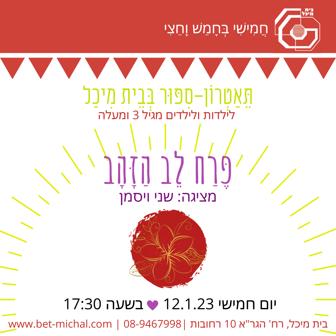 חמישי בחמש וחצי: תיאטרון סיפור בבית מיכל פרח לב הזהב | שני וייסמן יום חמישי, 12.1.23 | 17:30 תיאטרון סיפור עם שני וייסמן. דנה יוצאת למסע למצוא פרח מרפא לאמה…